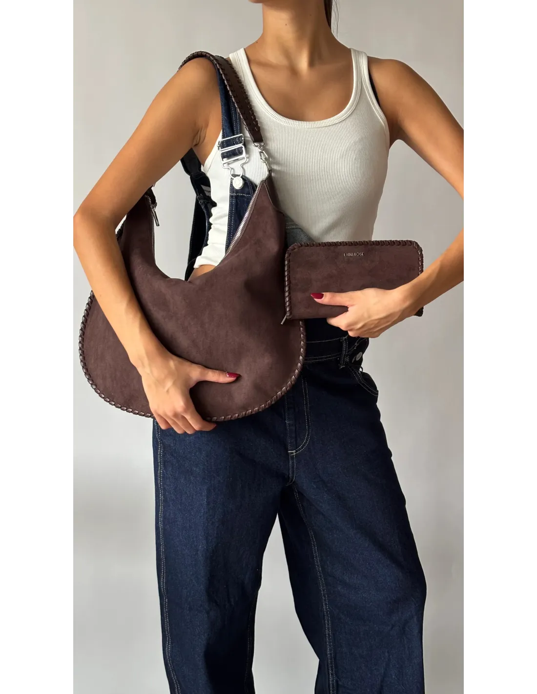 Elegante e versatile, la borsa Aurora è realizzata in doppio tessuto: simil camoscio e PU liscio, per un look sofisticato e contemporaneo. Il manico in PU con moschettoni è arricchito da un raffinato dettaglio intrecciato laterale, che richiama il fondo della borsa anch’esso intrecciato. Pratica chiusura con zip e interno capiente con unico scomparto dotato di due taschine, di cui una con chiusura a zip. Perfetta per accompagnarti con stile ogni giorno.