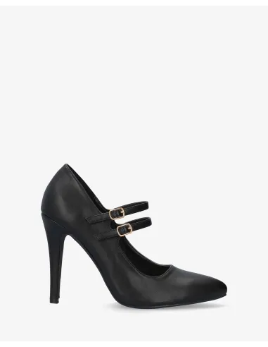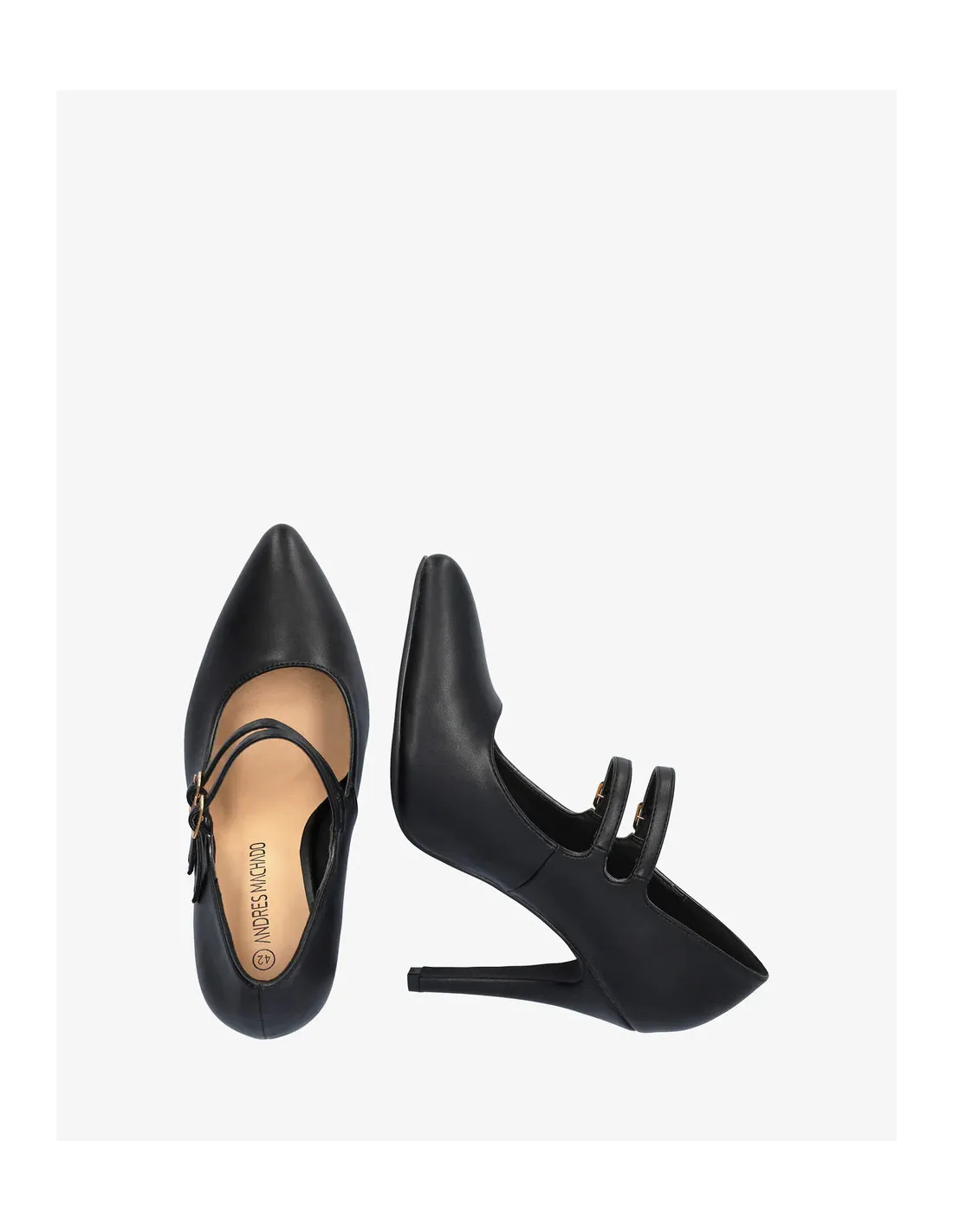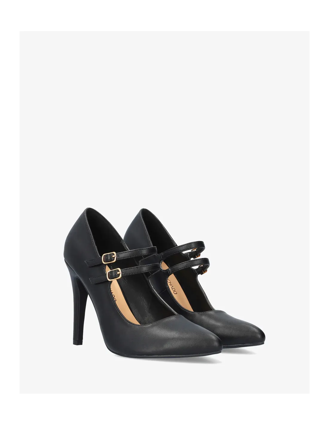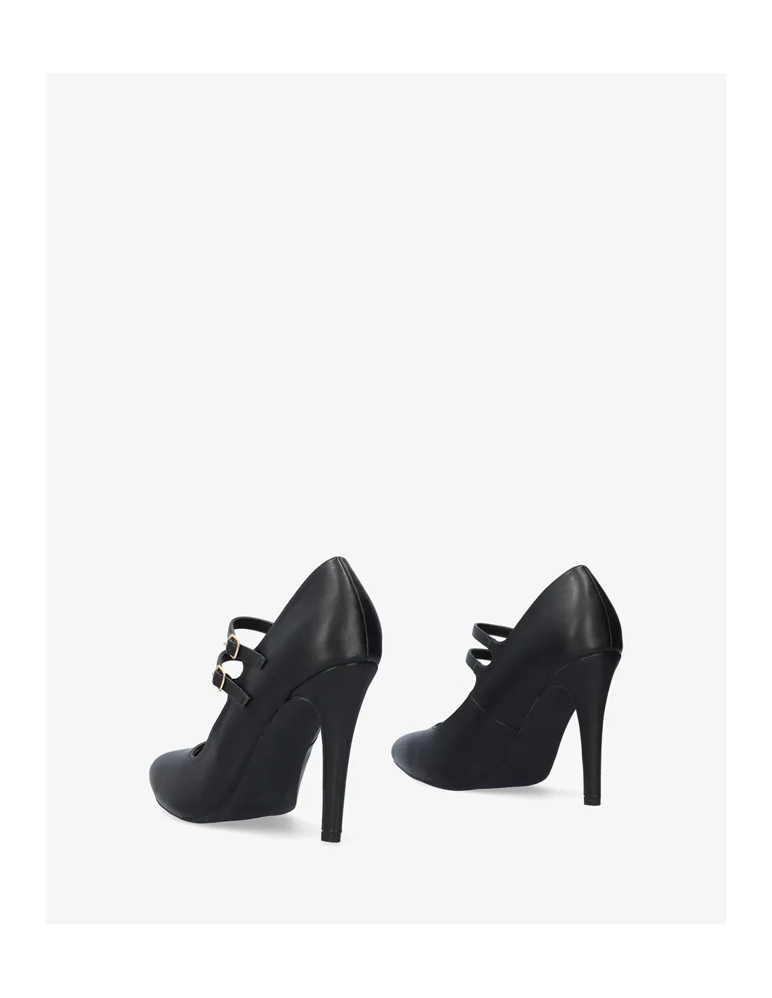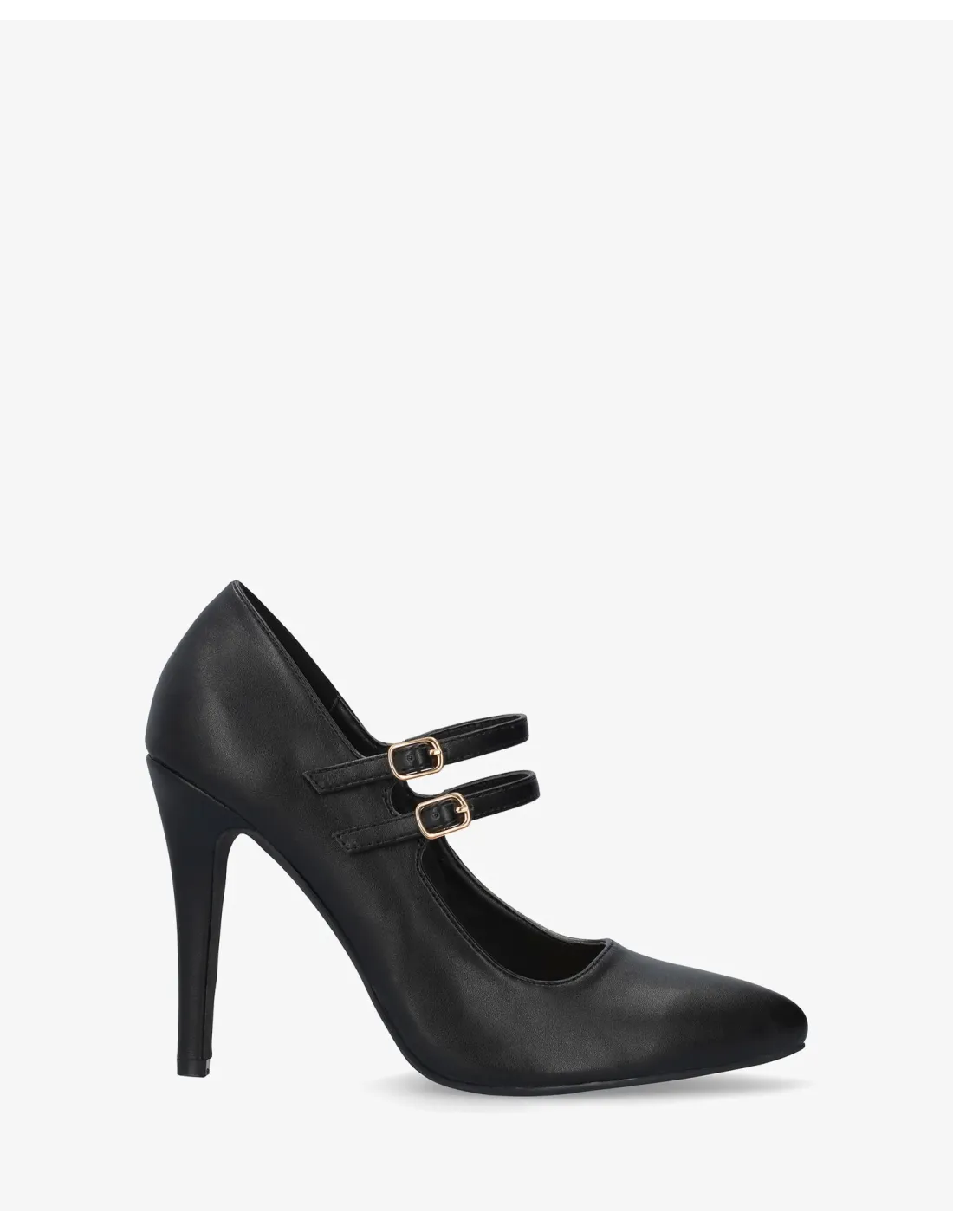 Scarpa in stile Mary Jane con punta affusolata e due sottili cinturini con fibbia sul collo del piede. Altezza tacco 10 cm per le taglie piccole dal 32 al 35.