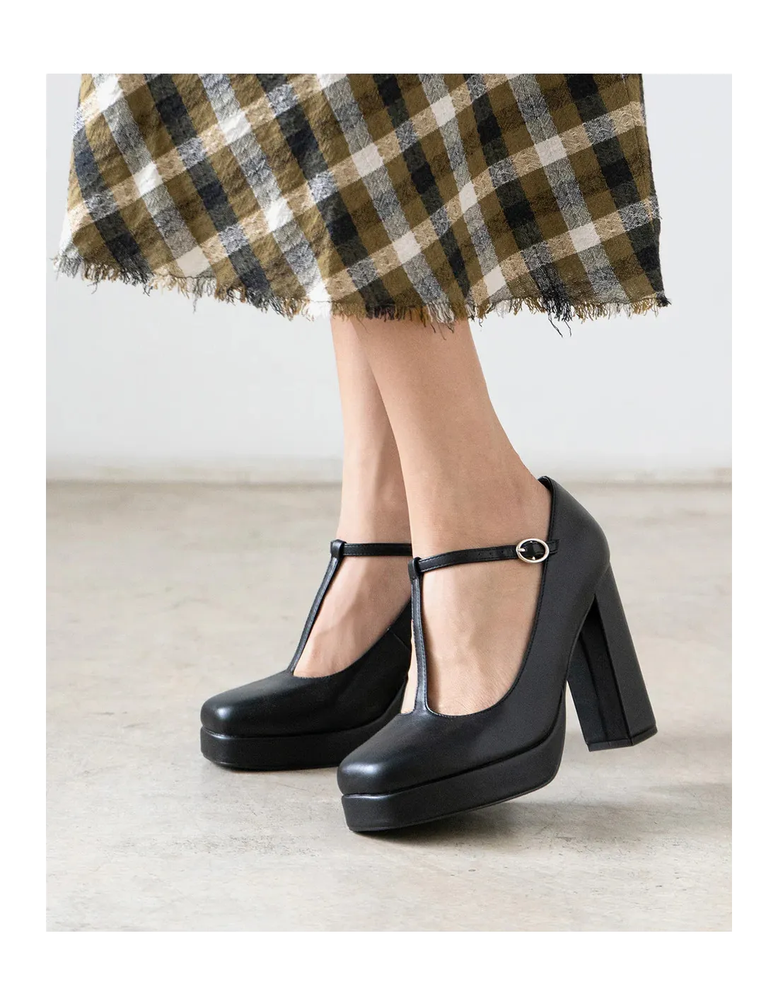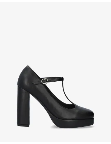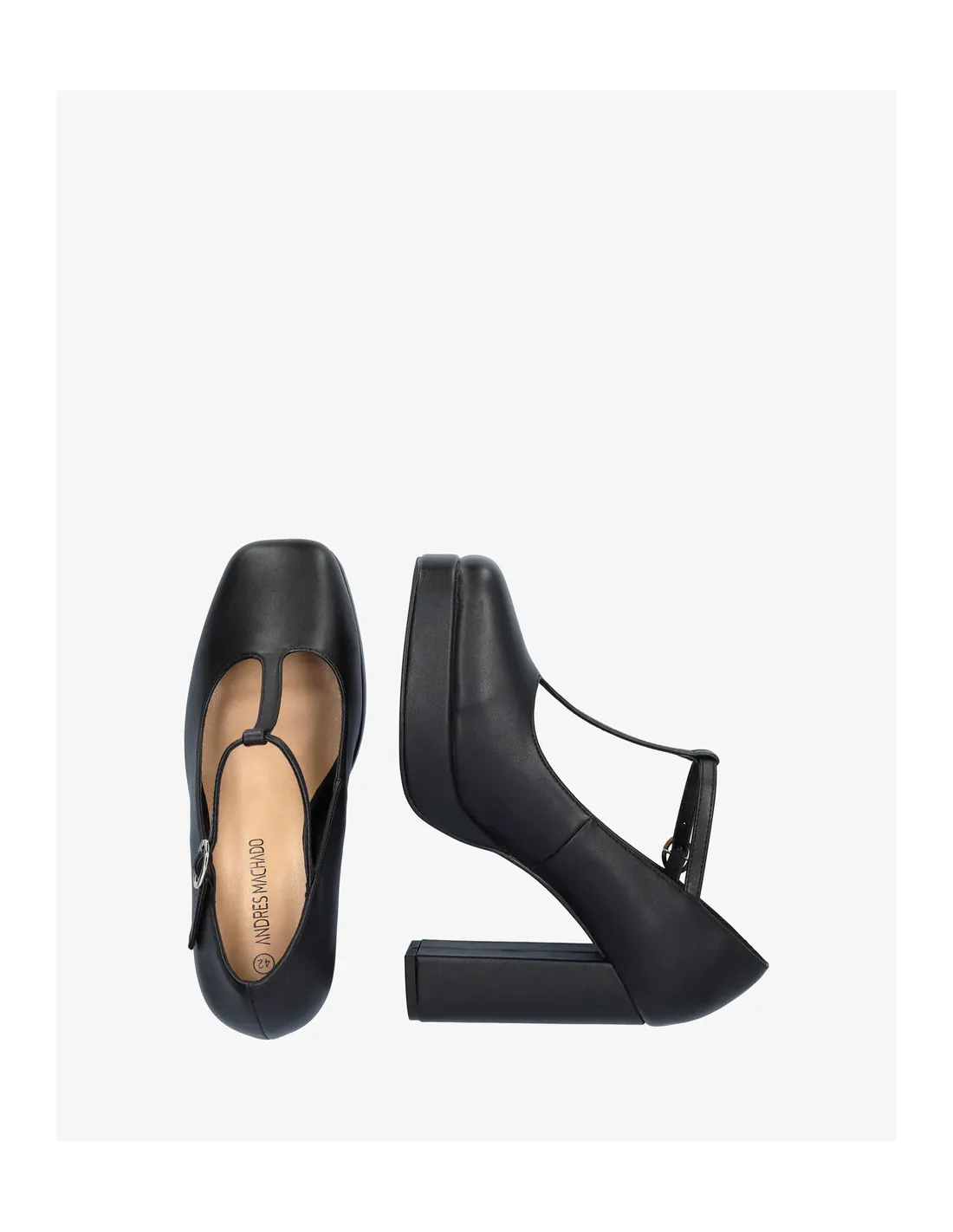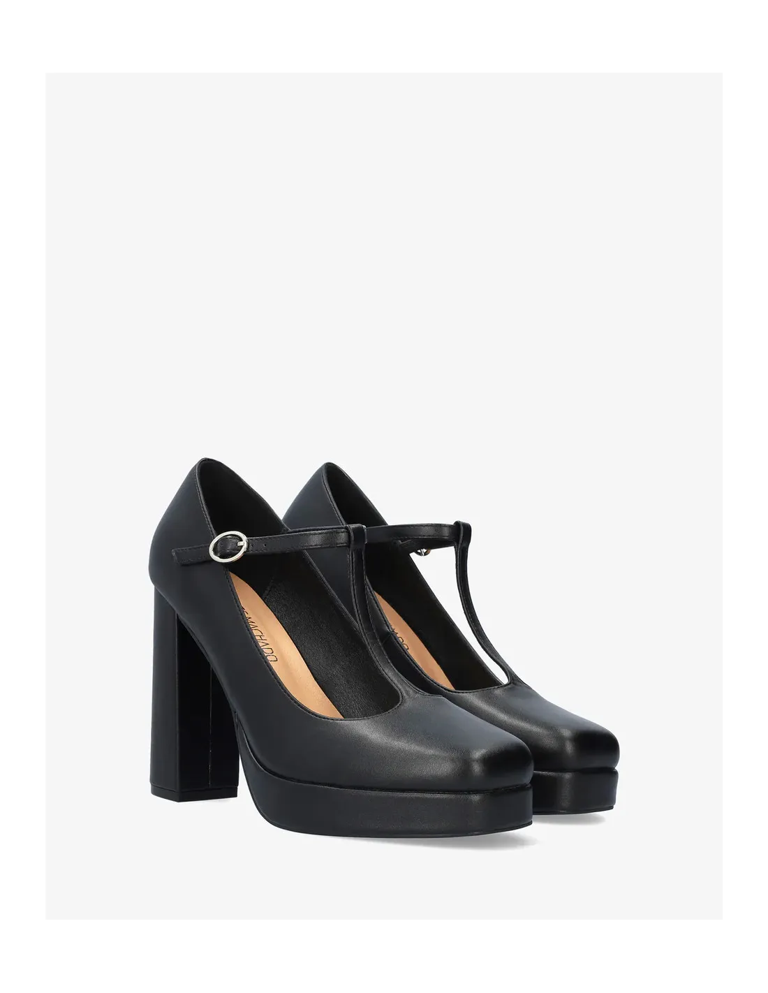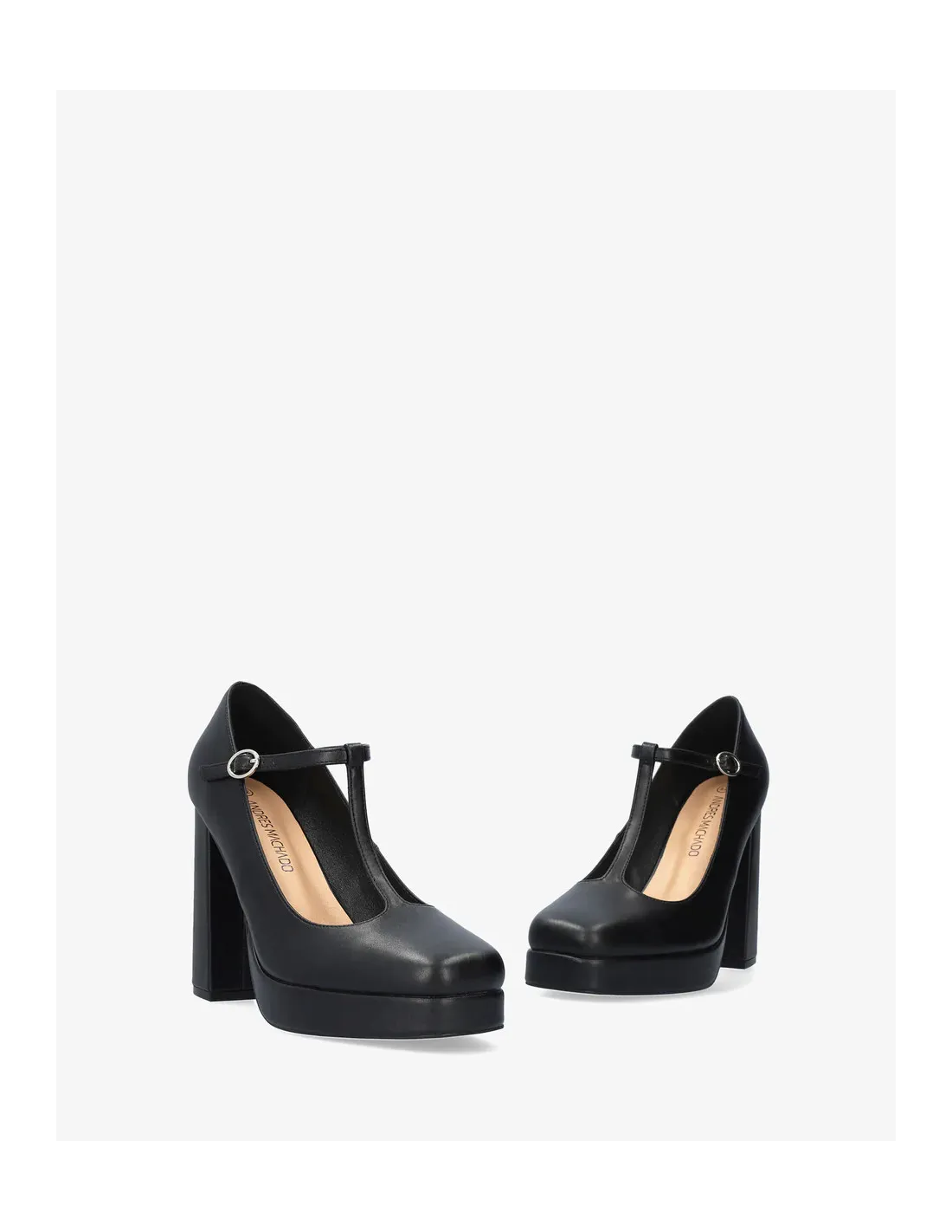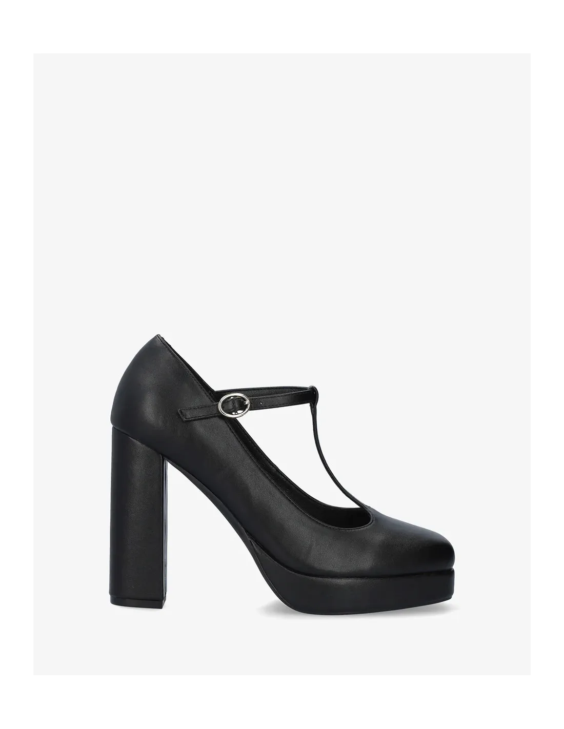 Décolleté Salomé con punta quadrata e cinturino centrale a T rovesciato sul collo del piede. Altezza tacco: 11 cm e plateau di 2 cm per le taglie piccole dalla 32 alla 35.