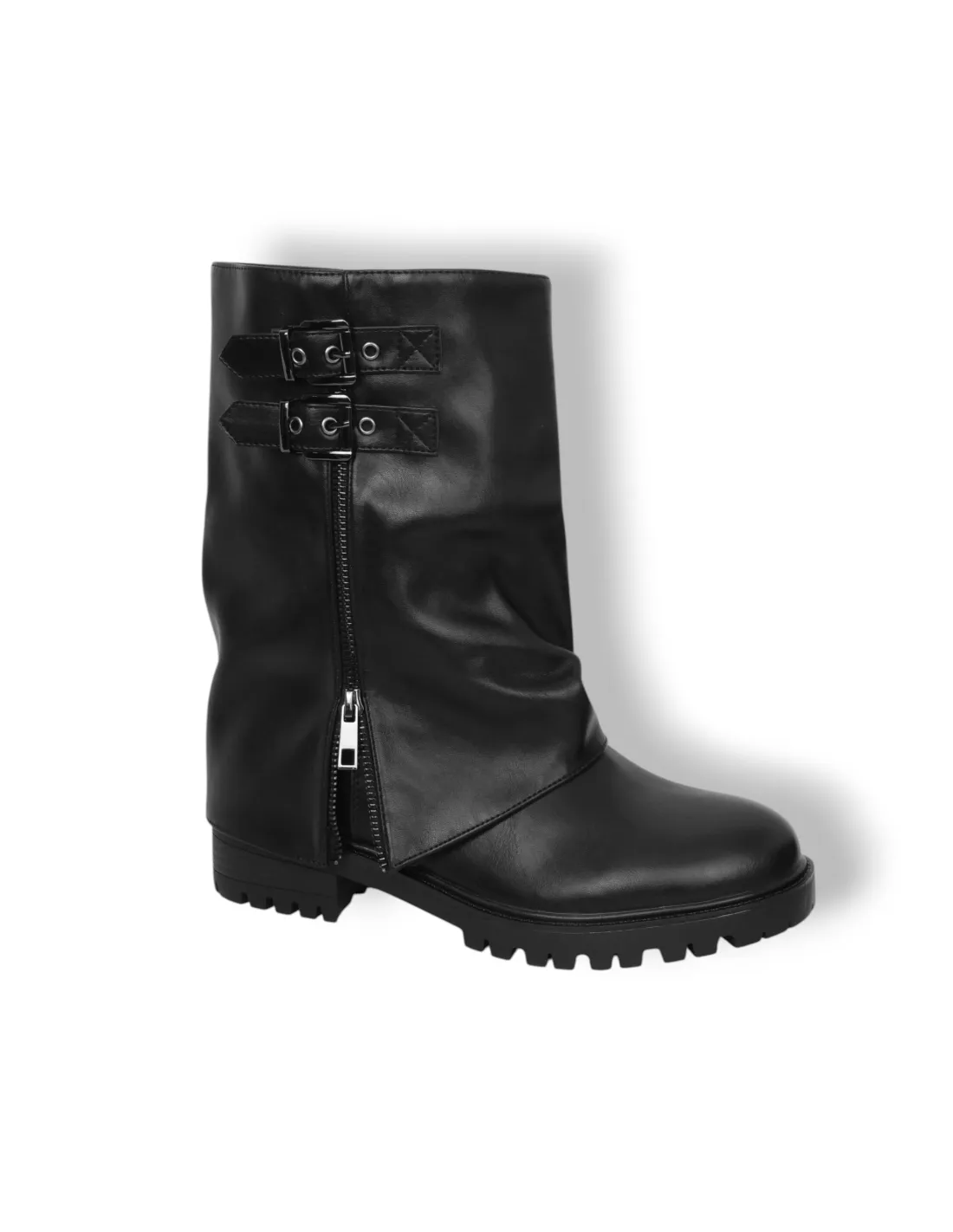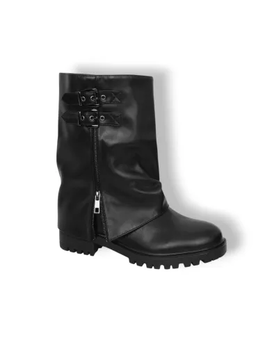 Stivale modello Biker con ghetta e fibbie laterali. Cerniera abbinata all'interno e getta leggermente arricciata nella parte del collo del piede, con suola in gomma nera e tacco 4 cm per i numeri dal 41 al 44.