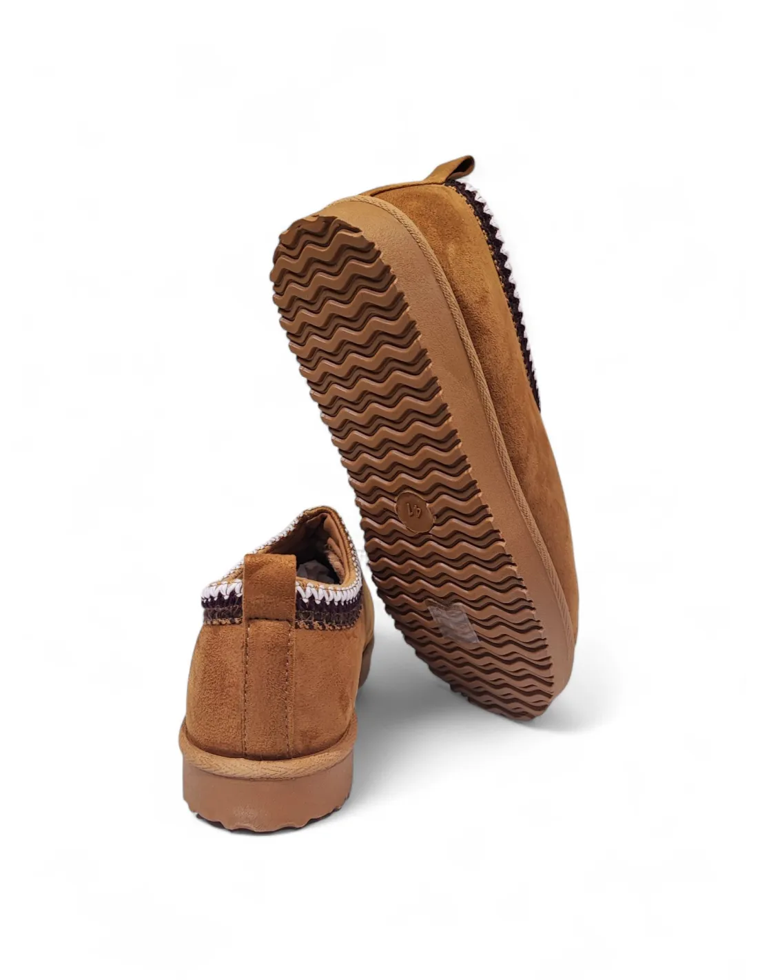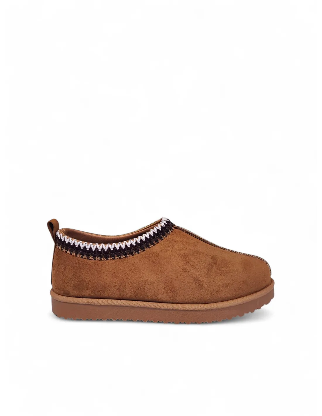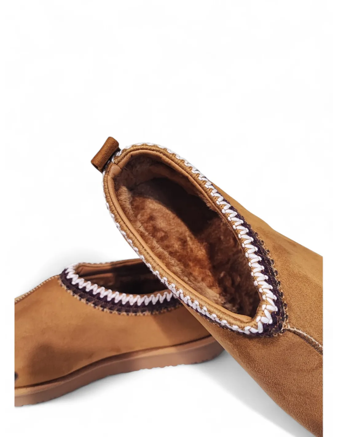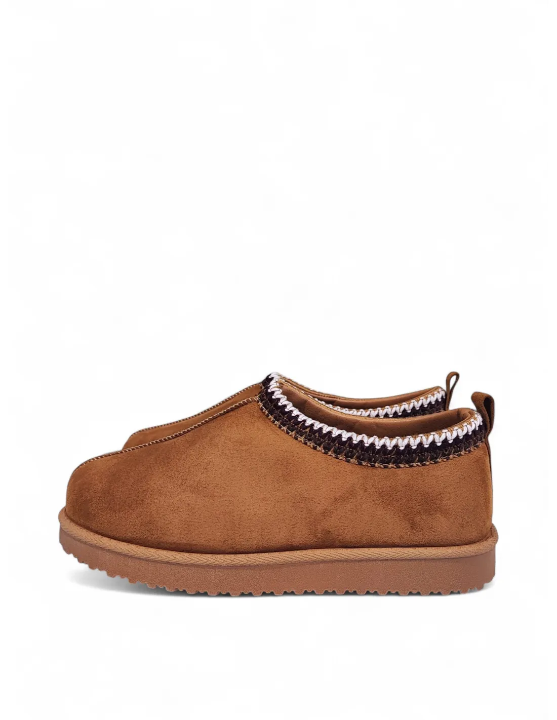 Sabot in suede cammello con bordo ricamato. Interno e soletta in eco-montone. Suola in gomma color caramello