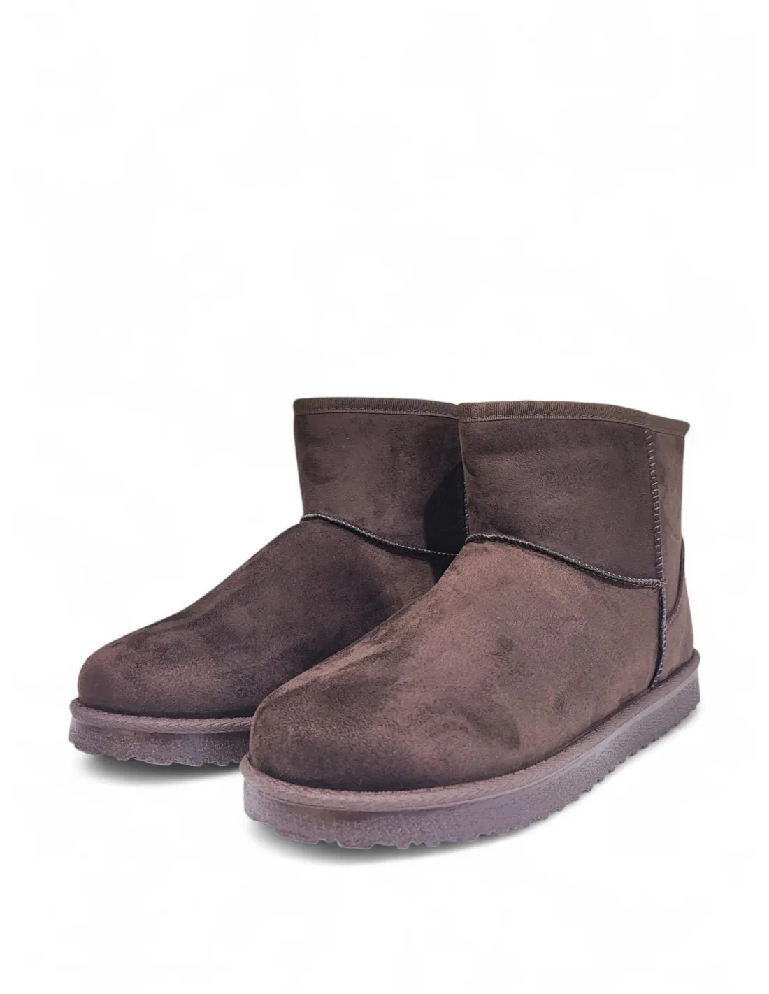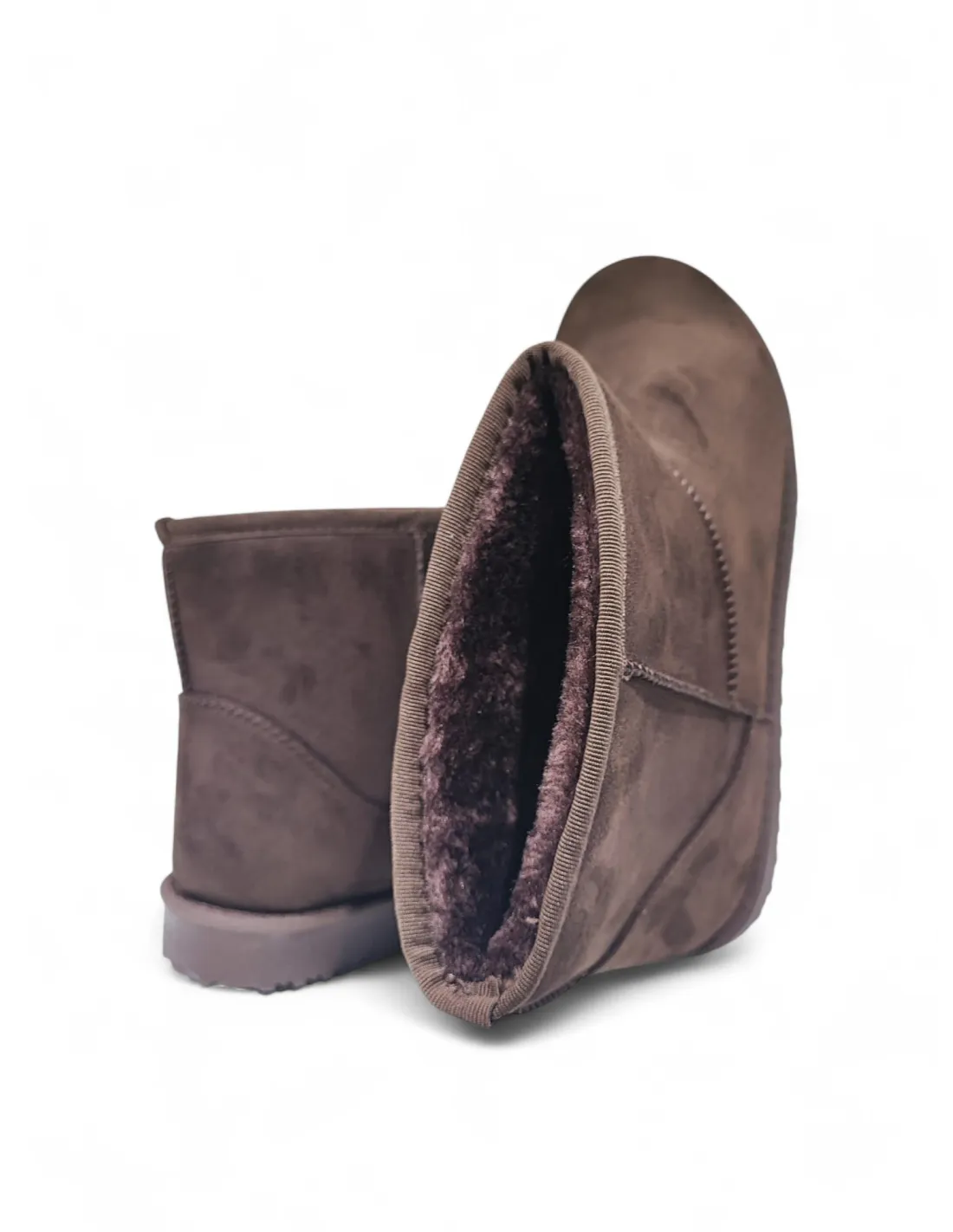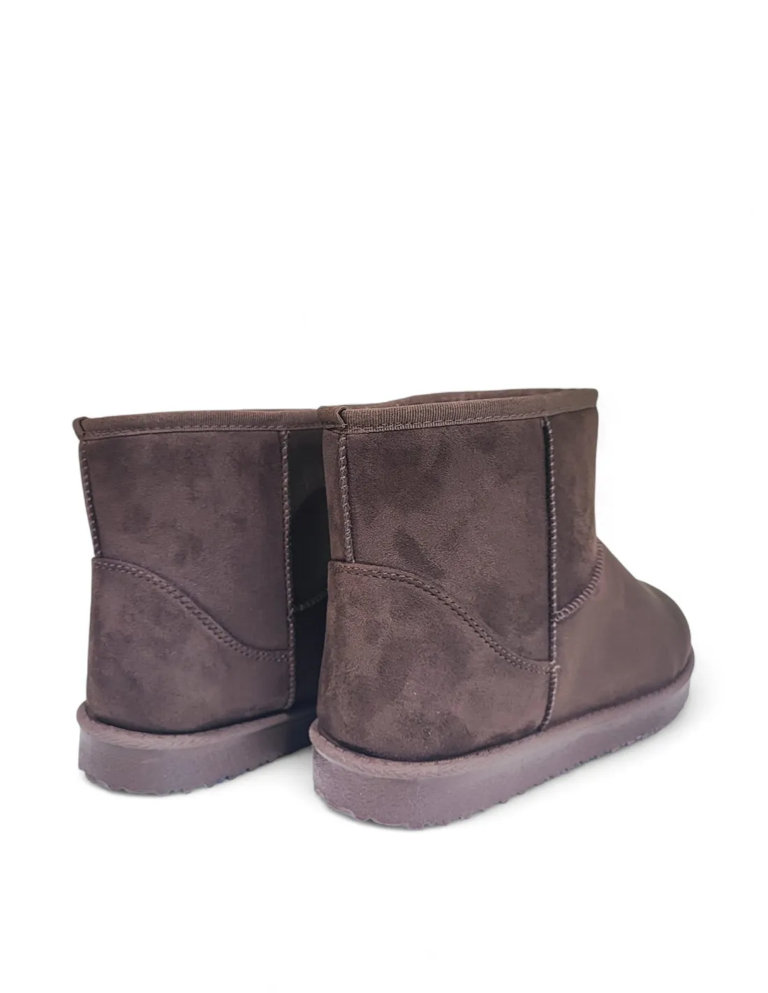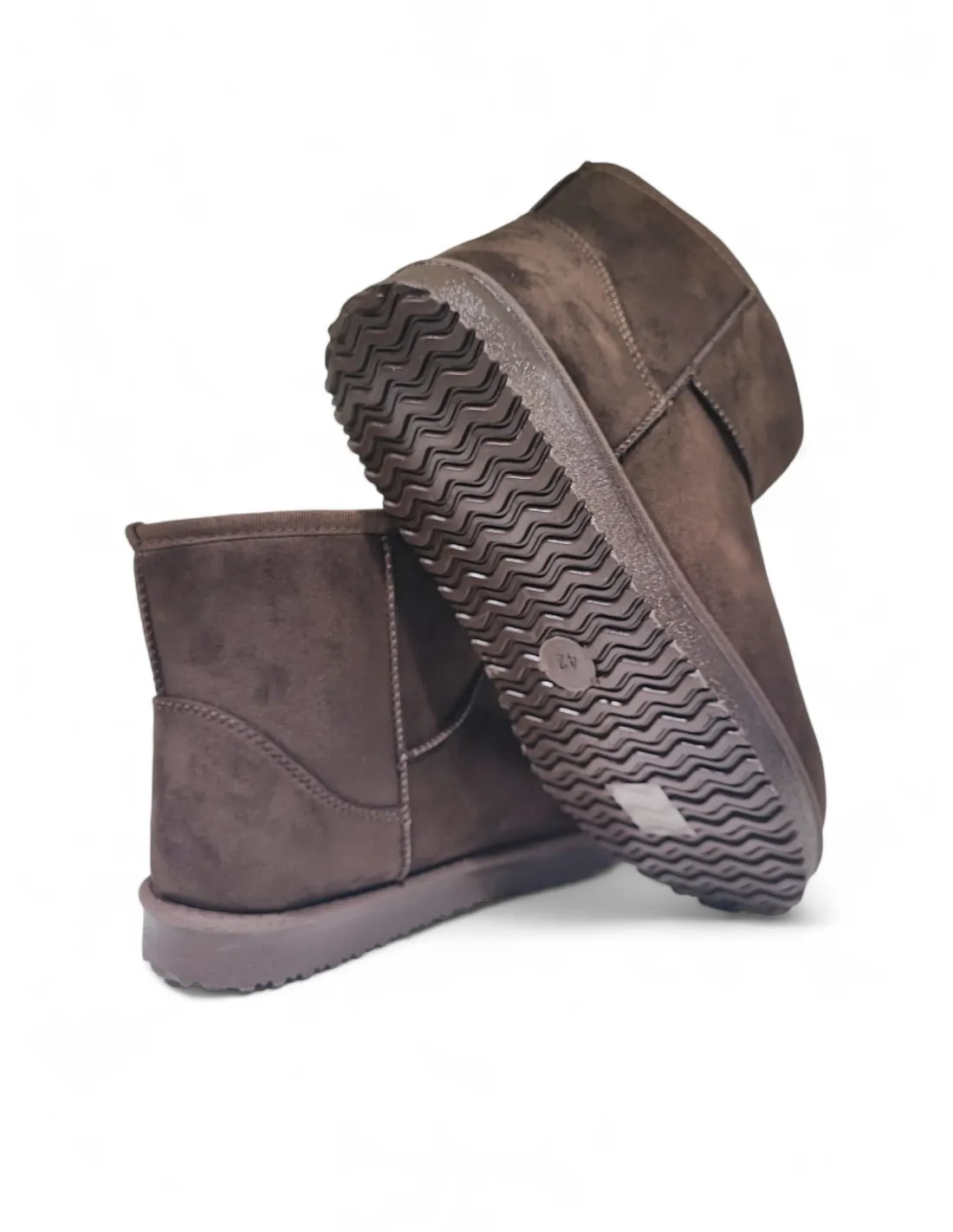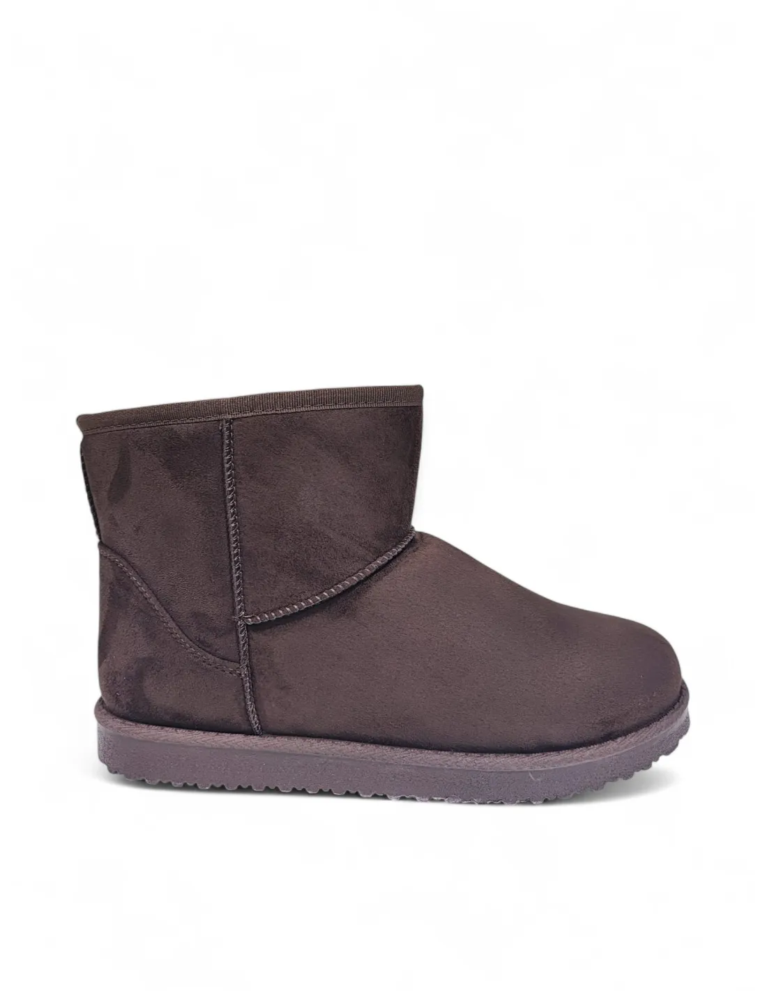 Stivaletto morbidissimo in suede color caffè. Imbottito internamente in eco-montone con rifinitura e suola in gomma su tono.